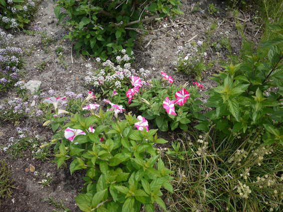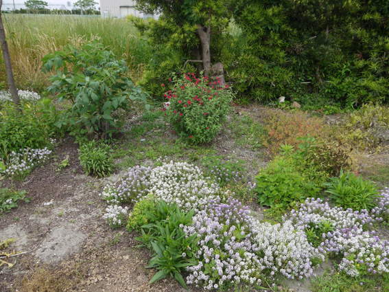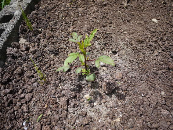 南側の猫の額畑に植えたローゼルハイビスカスは