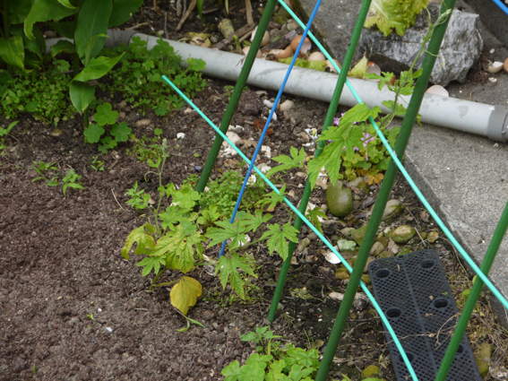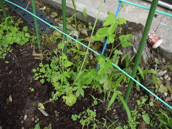 ゴーヤがだいぶ伸びてきました 側枝を伸ばすために芯を止めました