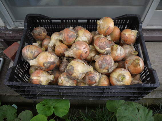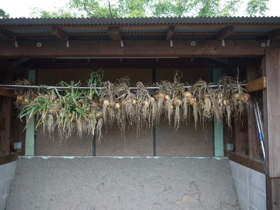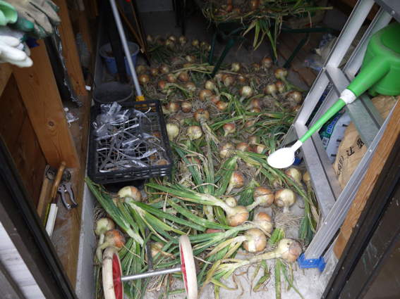 昨日収穫したタマネギは倉庫の床にひろげて乾燥することに