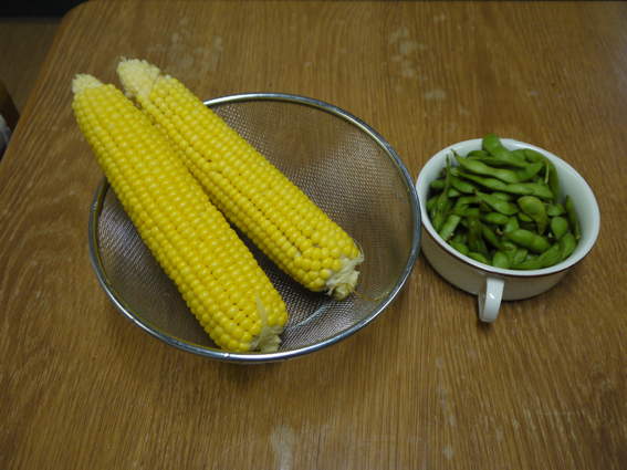 夕食はお好み焼きでしたがトウモロコシや枝豆の初物も食べました