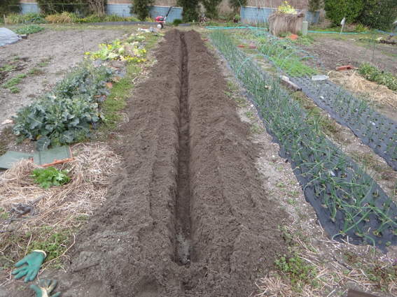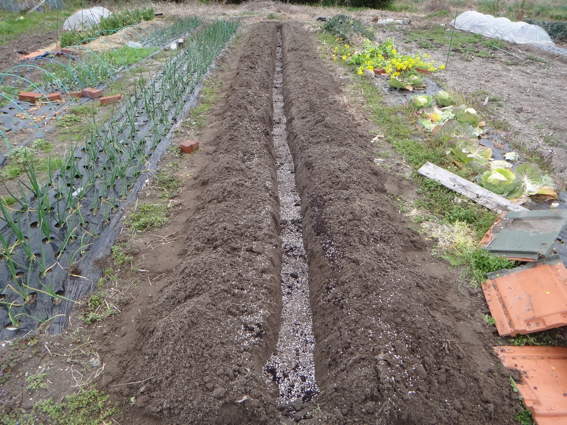 朝七時前から畑を耕し 鍬で少し深い溝を掘りました