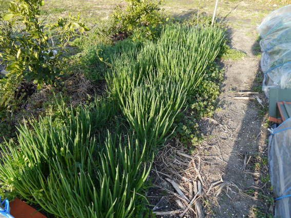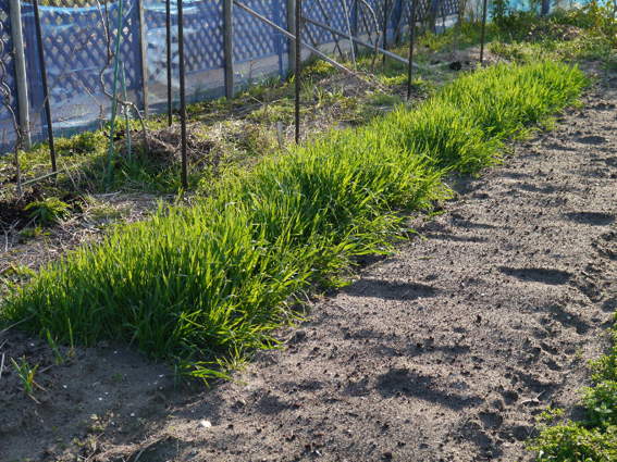 右のライ麦はだんだん背が高くなってきました 左はニンニク畑です