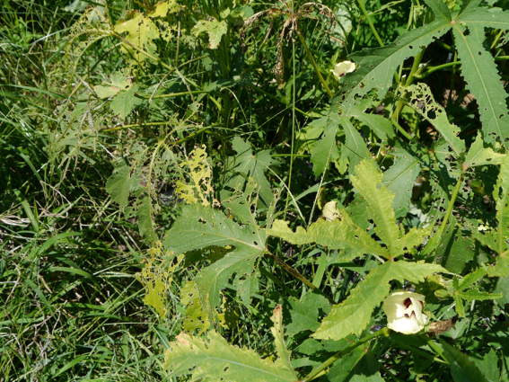 台風後に移植したローゼルハイビスカスもコガネムシの食害にあいながら