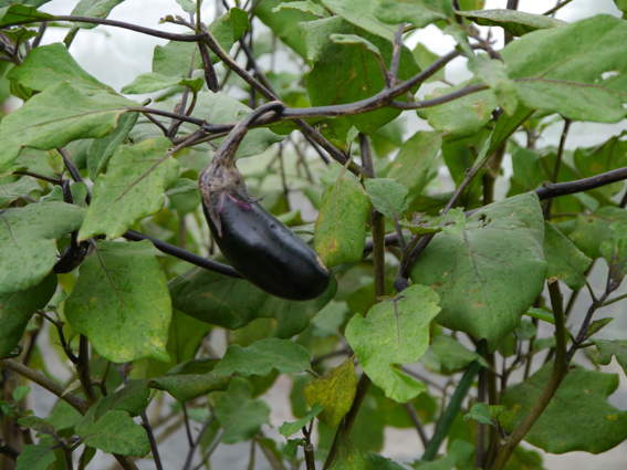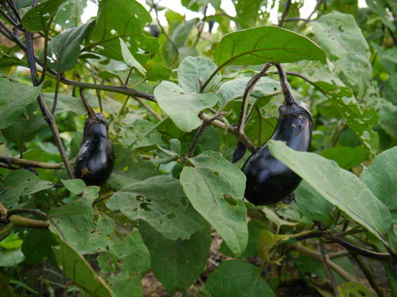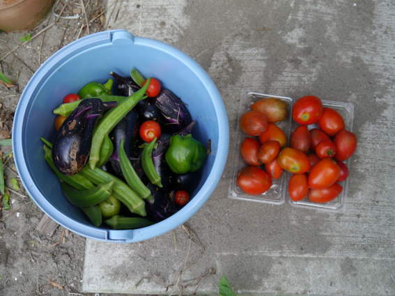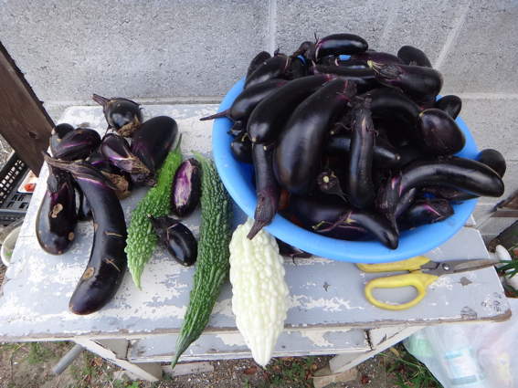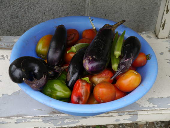 今日のささやかな収穫物 ナス オクラ ピーマン トマト