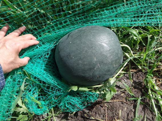 これ未熟なスイカですが 向こうのネットをかけたスイカ畑から