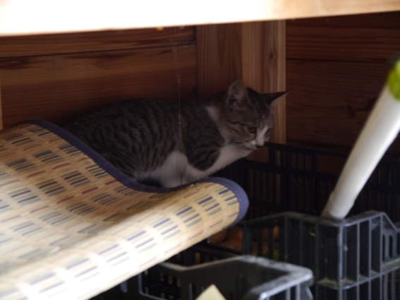 倉庫の扉を開けたままにしていたら デッキの下を定宿にしている
