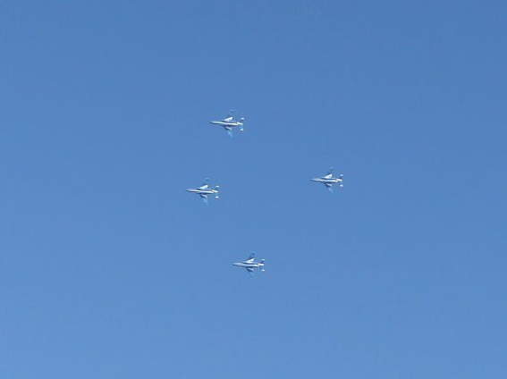 航空ショーに出演中のジェット戦闘機の編隊が上空に出現