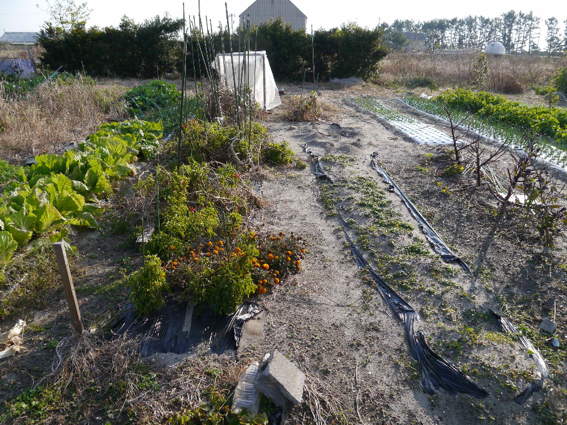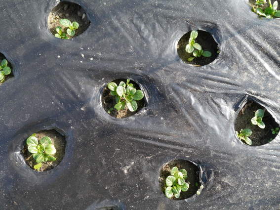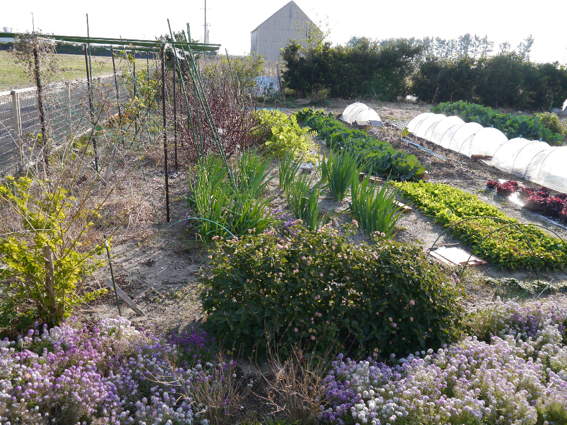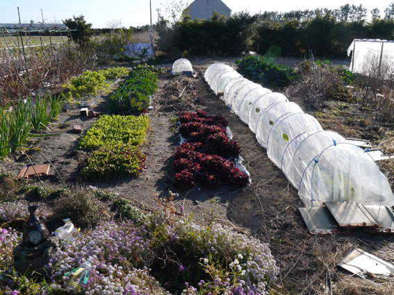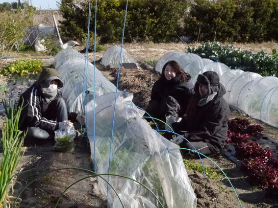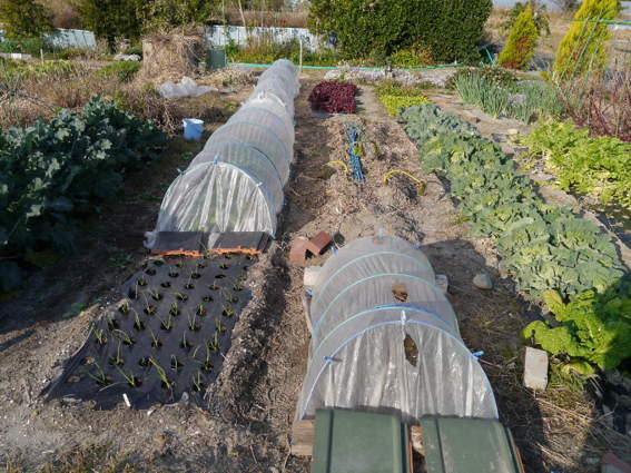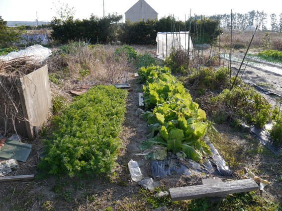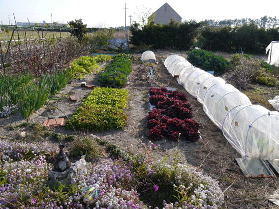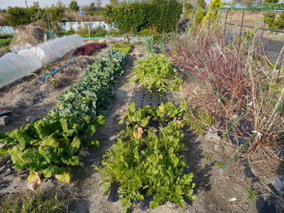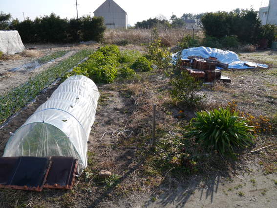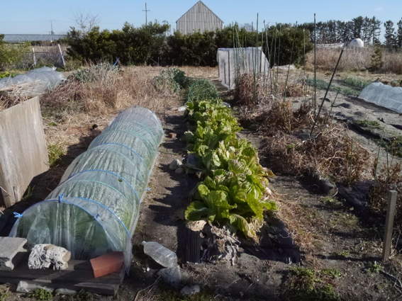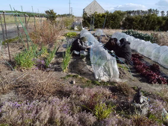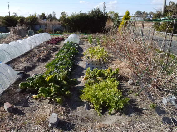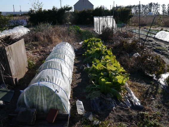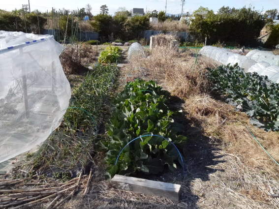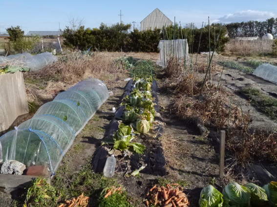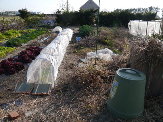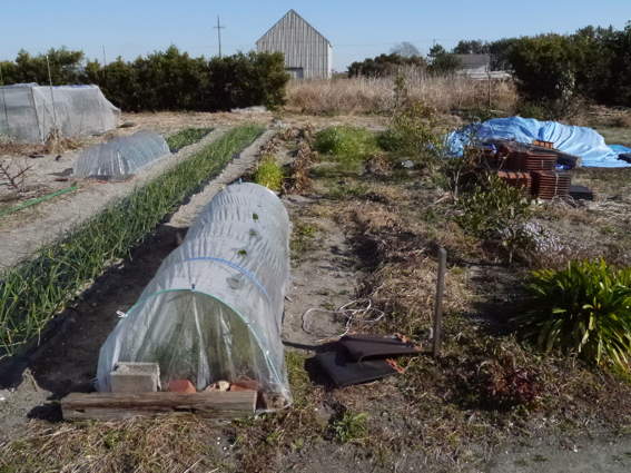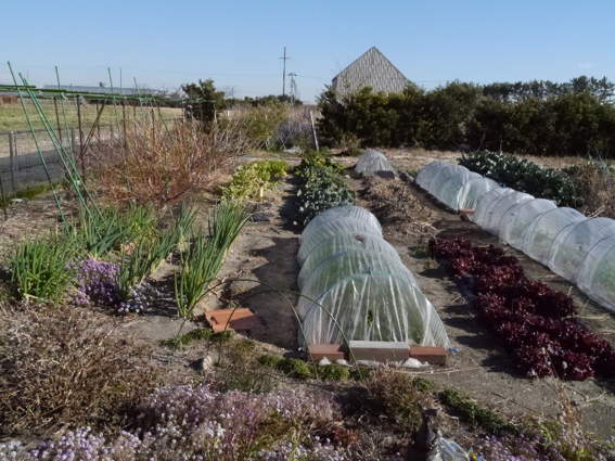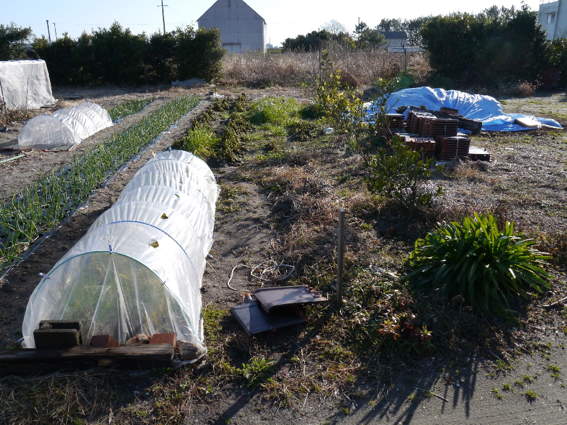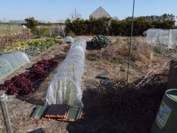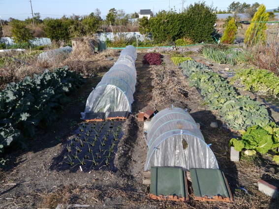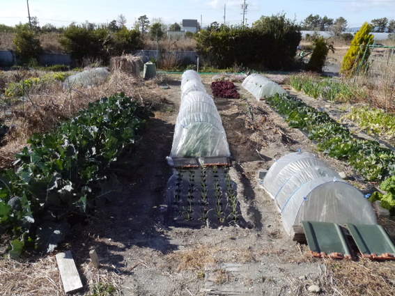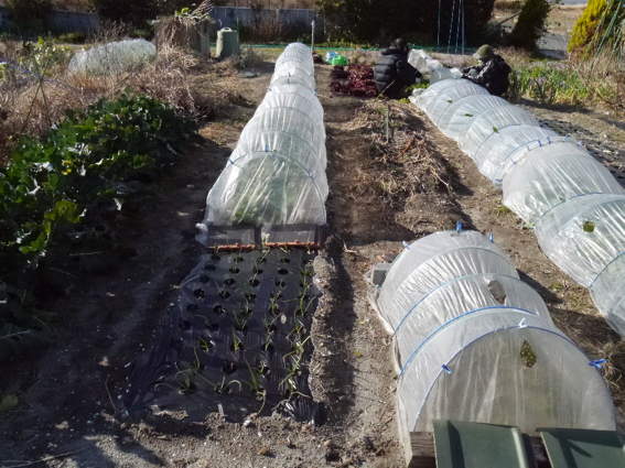 左のルッコラとホウレンソウの畑は防寒トンネルをしました