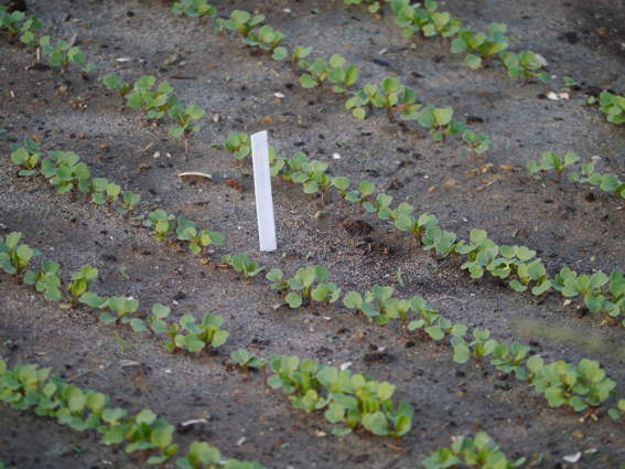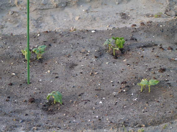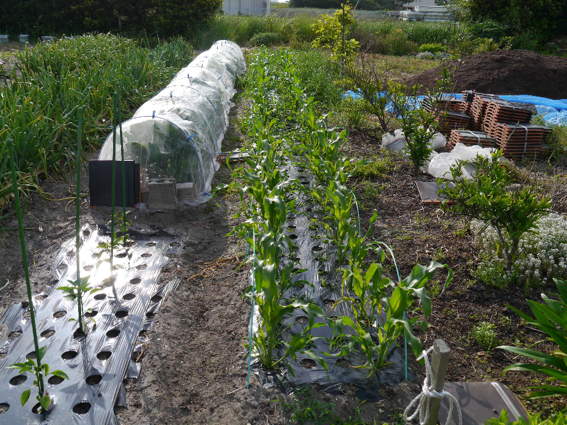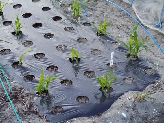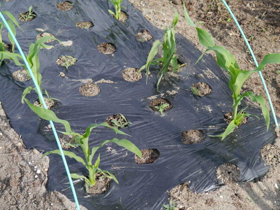トウモロコシはもう少し大きくなってから一本立ちにします
