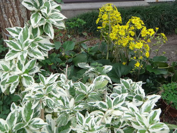 斑入り紫陽花の葉とツワブキのコンビネーションです