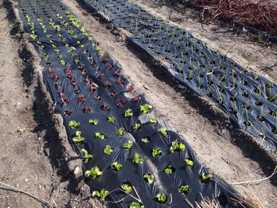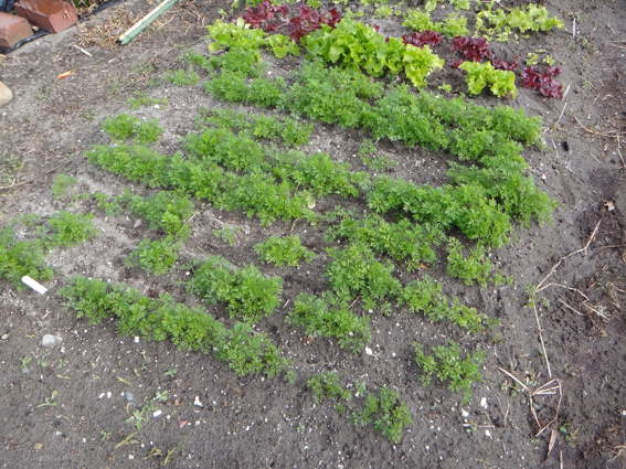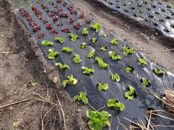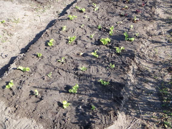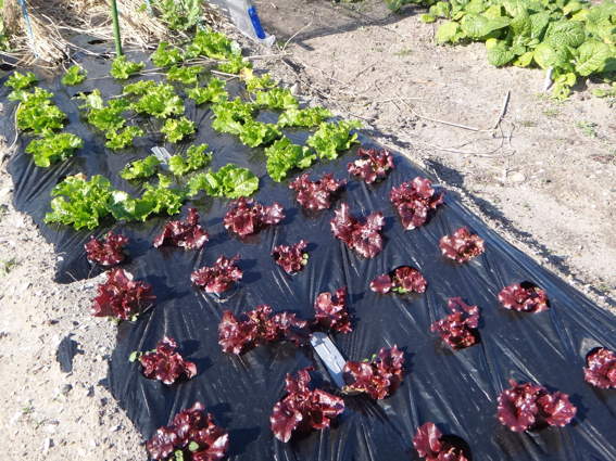 2週間前に移植したリーフレタスたち 右はタマネギです