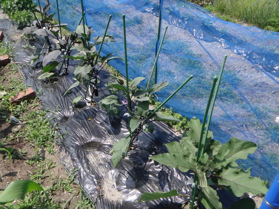 ナスに支柱を立てました 風で揺れてナスに傷が付かないようにね