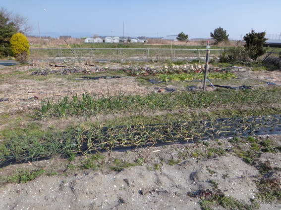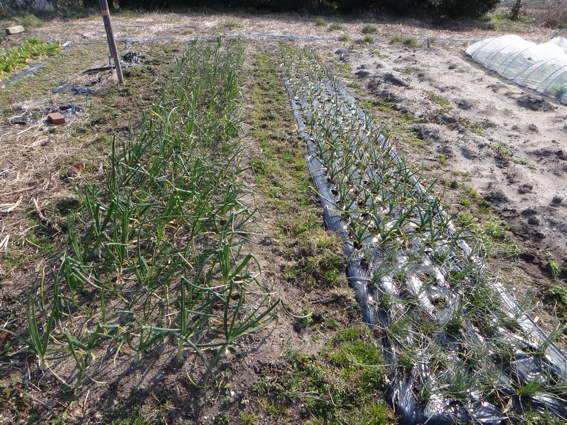 右はニンニク畑 中央はタマネギ + ニンニクです