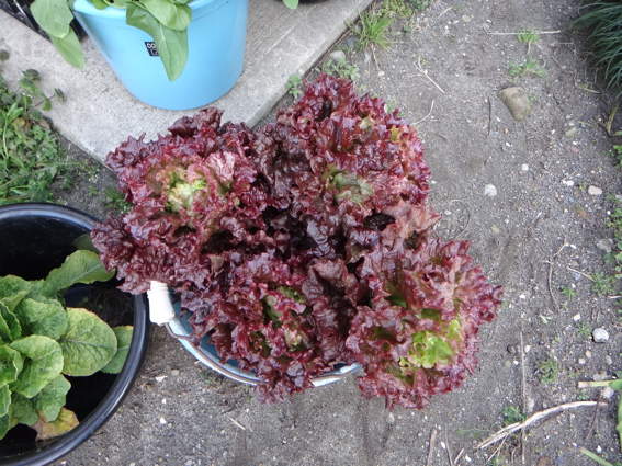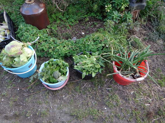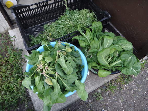 娘に収穫してもらったホウレンソウや水菜 そしてカツオ菜です