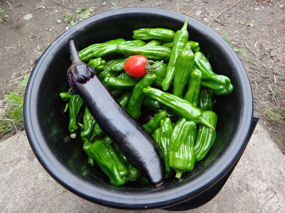 ナスやピーマンと家から持ってきた豚肉でちょっと甘く味付けした料理を