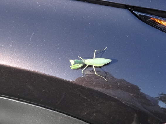 愛車にしがみつくカマキリ