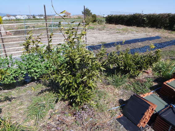 この左の枝がネーブルオレンジに接ぎ木した棘なしせとかです