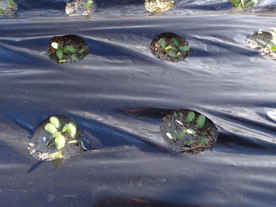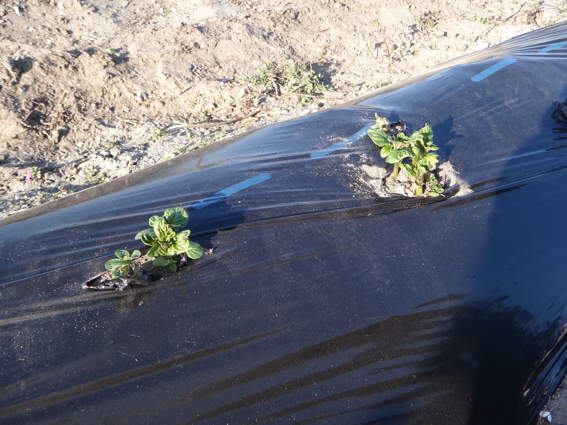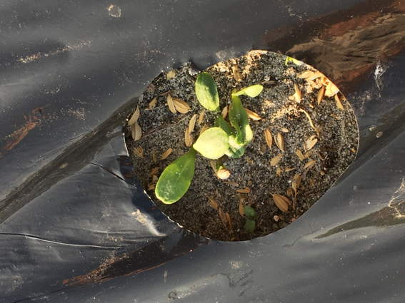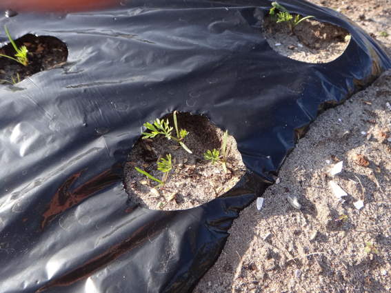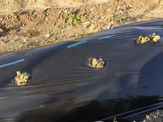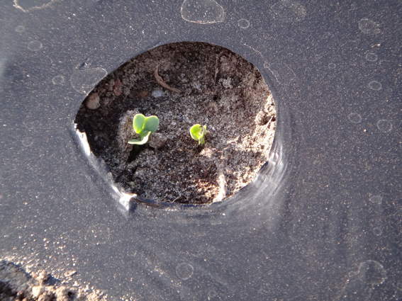 レッドムーンの新芽が出てきましたのでマルチに穴を開けました