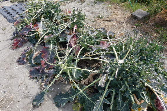 野鳥に葉っぱをぼろぼろにされているブロッコリー