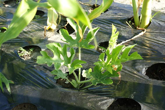 トウモロコシの間に植えたスイカの苗も生長しています