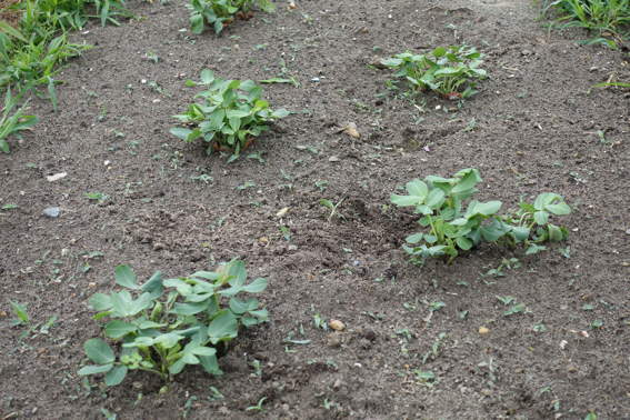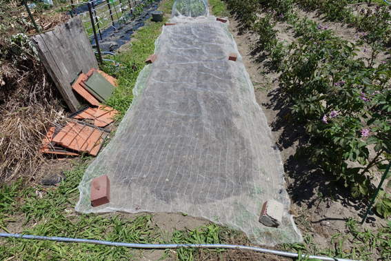 まず雑草に埋もれていたゴボウの草取りから エダマメもネットをかける前に