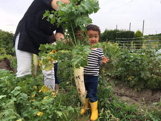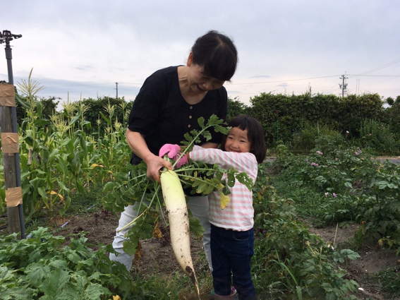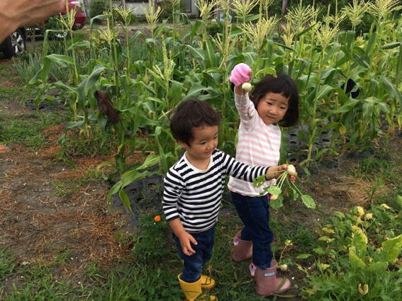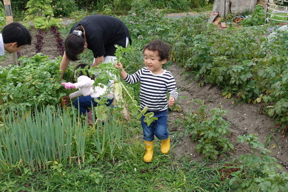 譲と美晴が小カブを収穫しています
