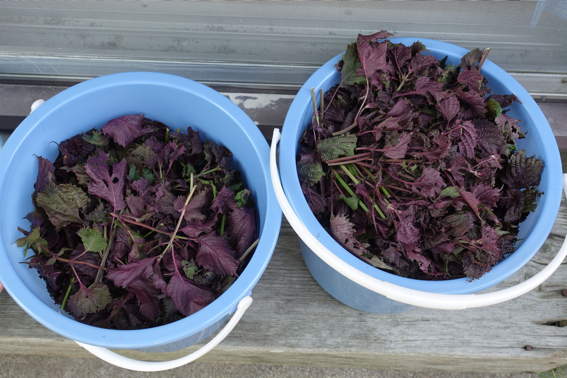 農場に着いてからヘッドランプを使って赤紫蘇の葉を収穫し