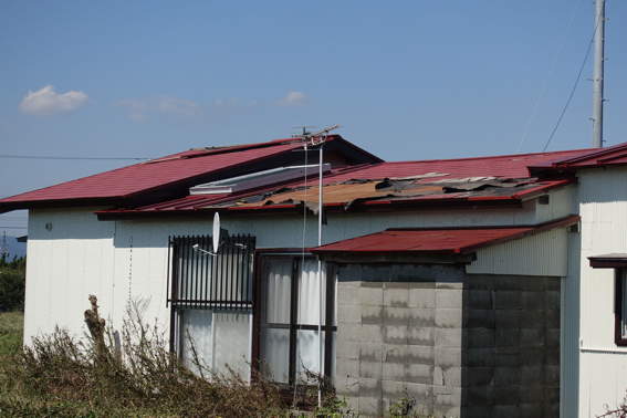 農場に着いたとき田中さんと屋根屋さんが屋根の上で被害状況を