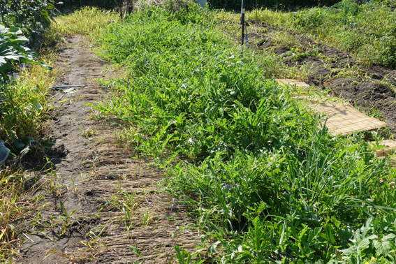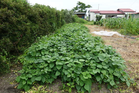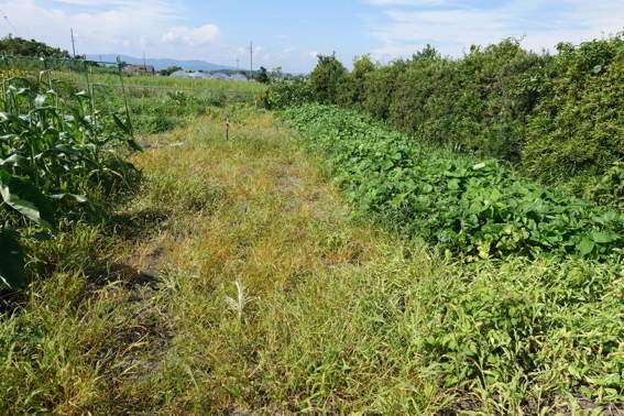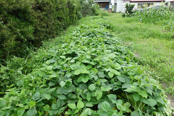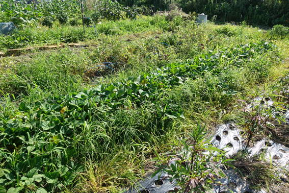 サツマイモの両横の雑草を刈ってやらないと