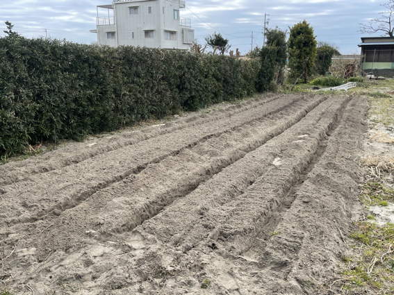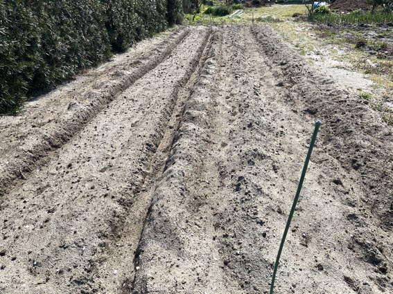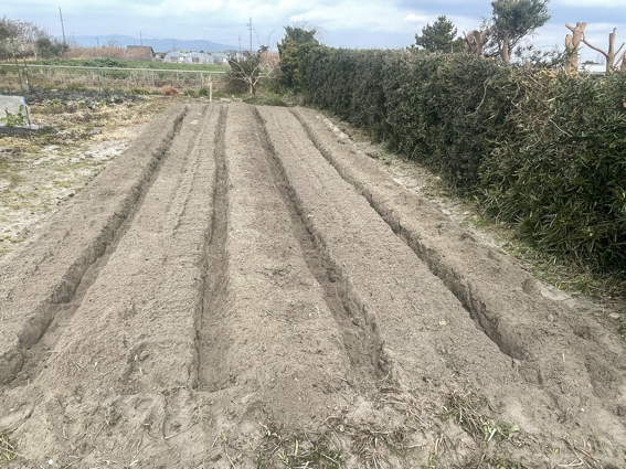 耕耘し植える溝を作ったジャガイモ畑です