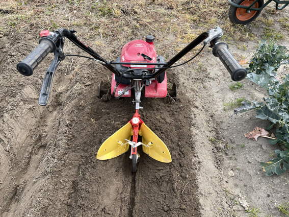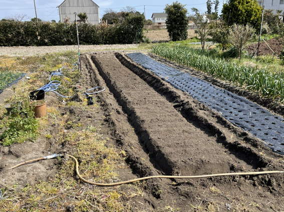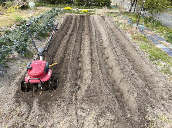 化成肥料を撒いてから耕運機で真ん中は4回両脇は2回耕します