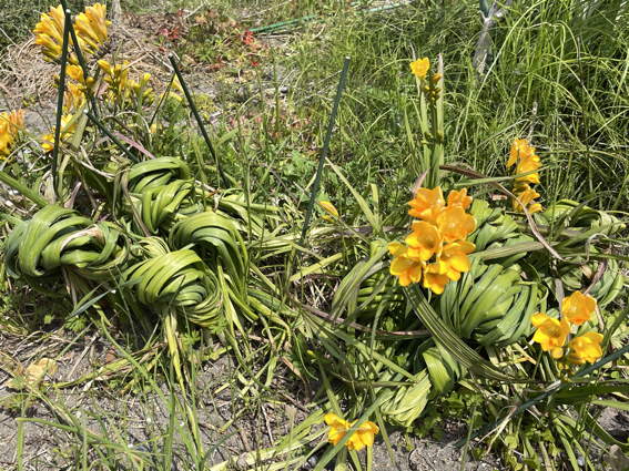 フリージアが咲いています 葉っぱを縛ってあるのは水仙かな?