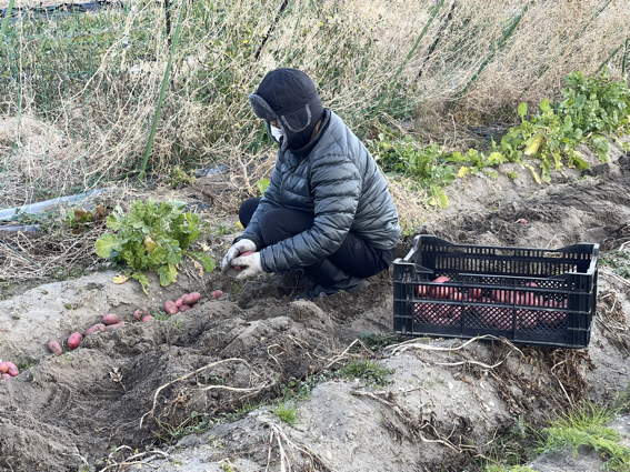 完全装備でジャガイモ掘りをするゆり様