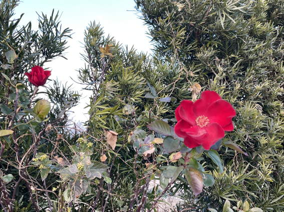 一重の赤バラが寒中に咲いています