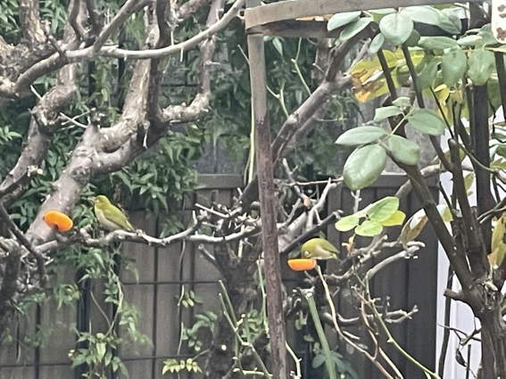 ミカンを半分枝に刺しておくと熱心に食べてます