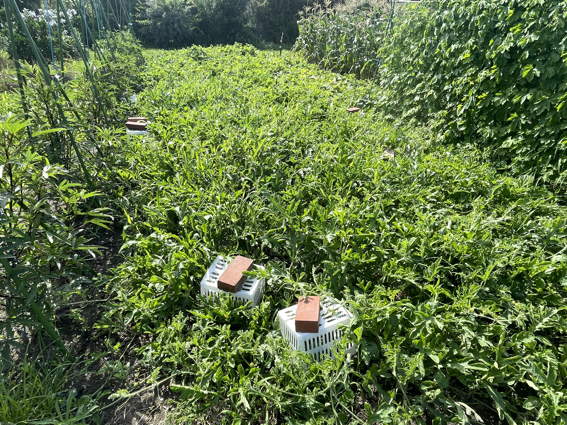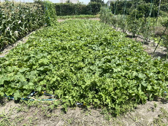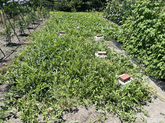 手前がスイカ畑 奥の左がクロウリで右がニューメロンです