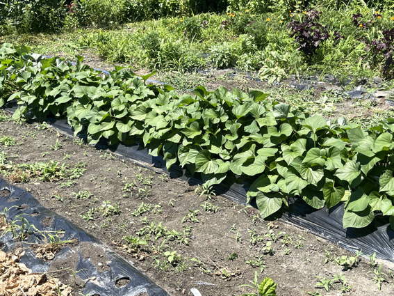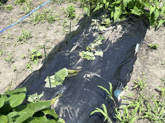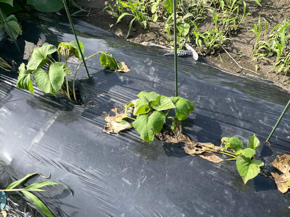 最初に植えた紅はるかのツルを切って空いているスペースに植えました