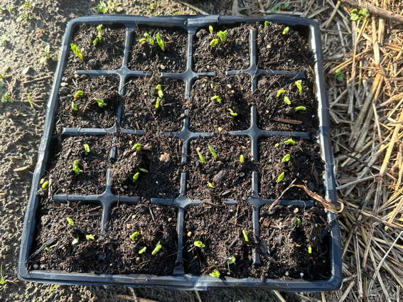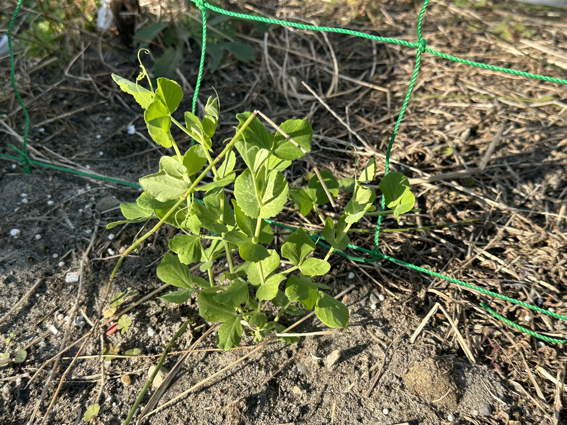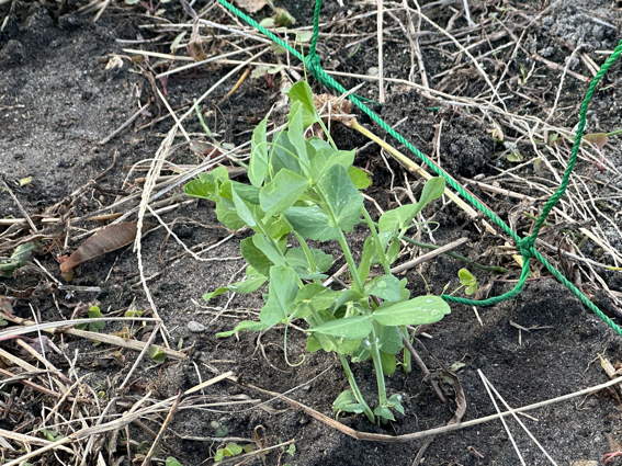 スナップエンドウの苗を畑で育てようと発芽したばかりのを