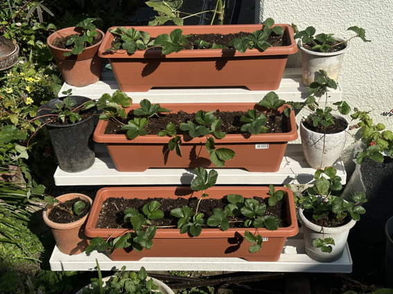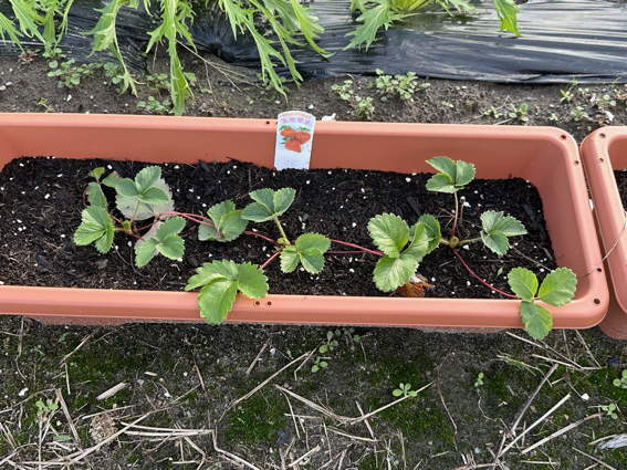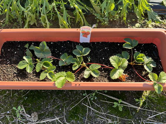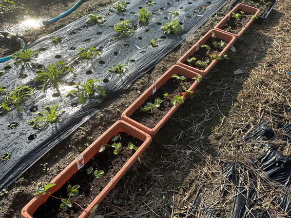 イチゴの苗をプランターに移植してスプリンクラーで水やりです
