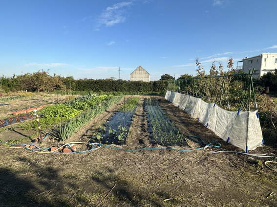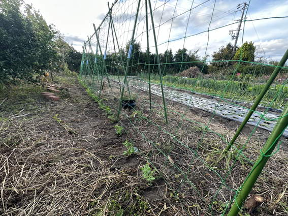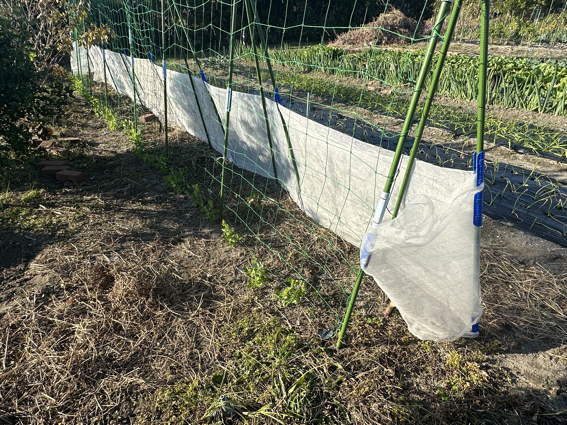 スナップエンドウに冷たい北風が当たらないように防虫ネットで