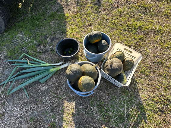 隣の畑からいただいたカボチャです ネギも2本初採りです