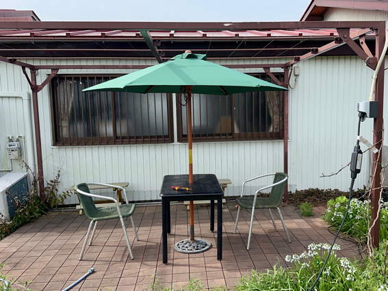 テーブルを畑に持ってきてガーデンパラソルもAmazonで購入