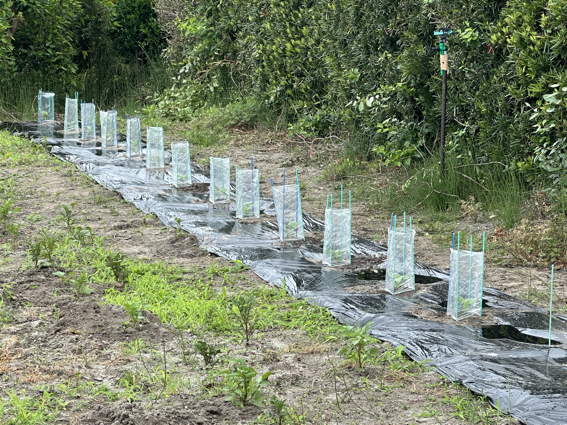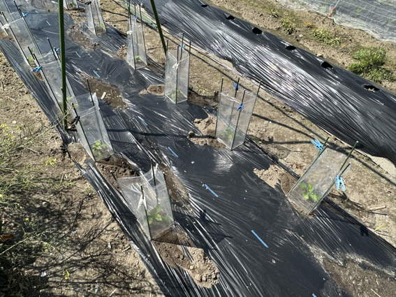 ナスの苗は行灯で保護してあります