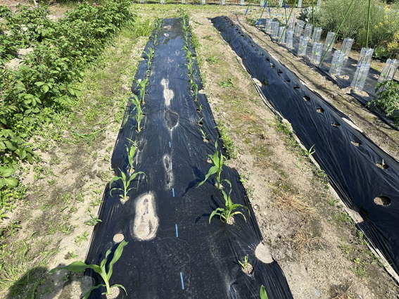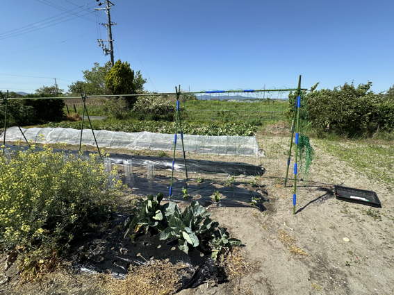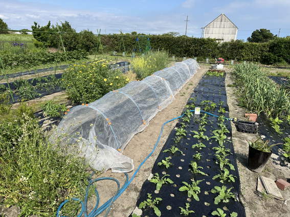 左の防虫ネットがかけてあるのがトウモロコシ畑です