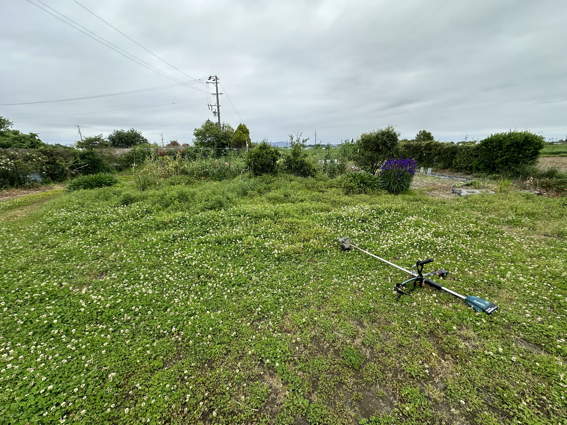 向こうは雑草だらけですので草刈機で少し手入れします