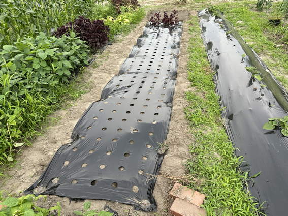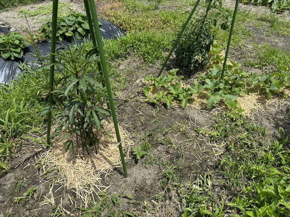 オクラも雑草だらけでしたので敷き藁をしました