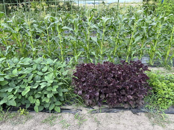 手前左は枝豆 右は赤紫蘇 向こうはトウモロコシです