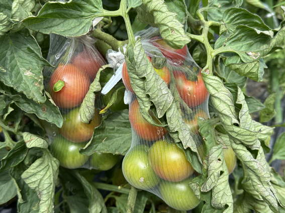 トウモロコシに不織布の袋をかけて鳥よけにしています