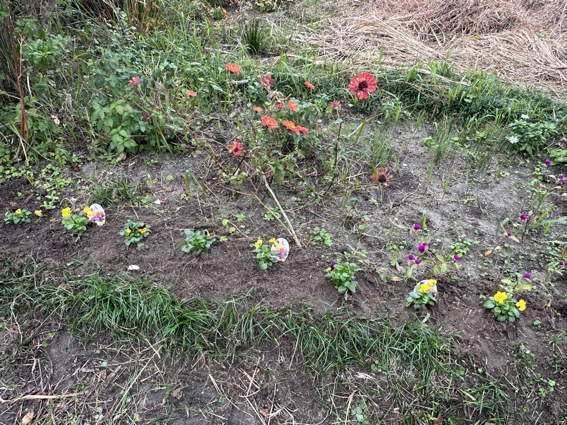 先日ゆり様が植えたビオラが何とか花壇の面目を保っています