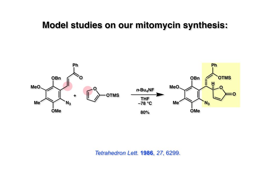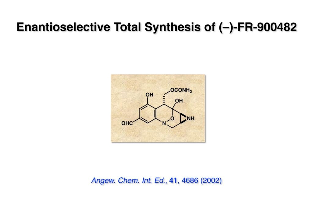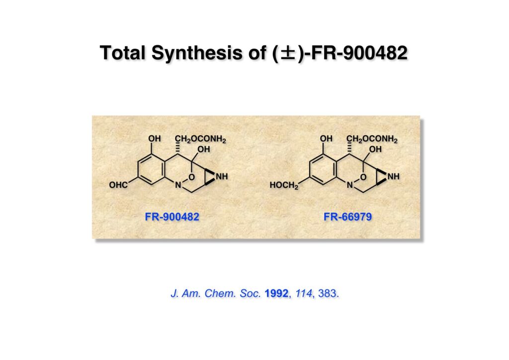FR-900482は藤沢薬品で単離構造決定された抗腫瘍活性を持つ化合物で、マイトマイシンCと似た作用機構を持つが毒性が比較的低いということで、上市がが期待されたが結局薬にはならなかった。藤沢薬品から五島俊介さんという研究員がライス大学に派遣されたので、FR-900482の全合成を始めることにした。マイトマイシンCとは違った合成上の困難さがあり、なかなか短工程化が出来なかったのが悔しいところである。ただ、最初の全合成に成功したことで、最終工程近くでの中間体の不安定さや微妙な条件が必要だということを示せたのは、後から全合成を達成した人たちに貴重な情報を与えたと思う。